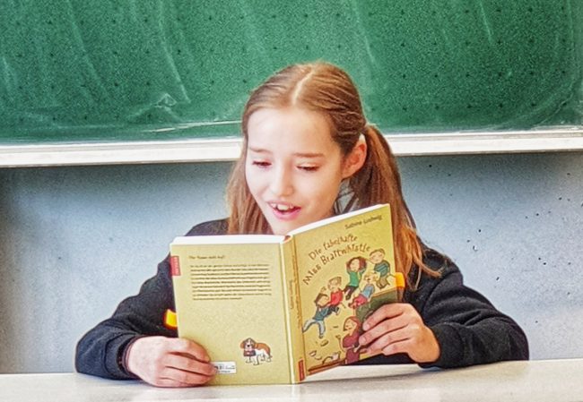 Ein Schulinspektor und eine dicke Musiklehrerin, die durch einen nassen Tafelschwamm zu Fall kommen … Mit einer gut gewählten Textpassage aus Sabine Ludwigs „Die fabelhafte Miss Braitwhistle“ regte Mira Frasch…