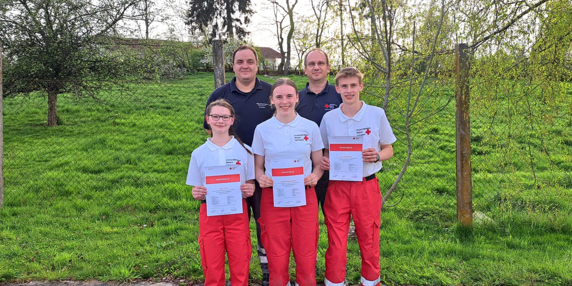 Gratulation zur bestandenen Prüfung an Sarah Golla (9d), Hannah Becker (9b) und Julius Gottschling (9d) und vielen Dank für euern Einsatz am und für das Wieland-Gymnasium. (Auf dem Bild von links nach rechts zusammen mit René Müller(Prüfer) und Helmut Plonka (Ausbilder/Prüfer))