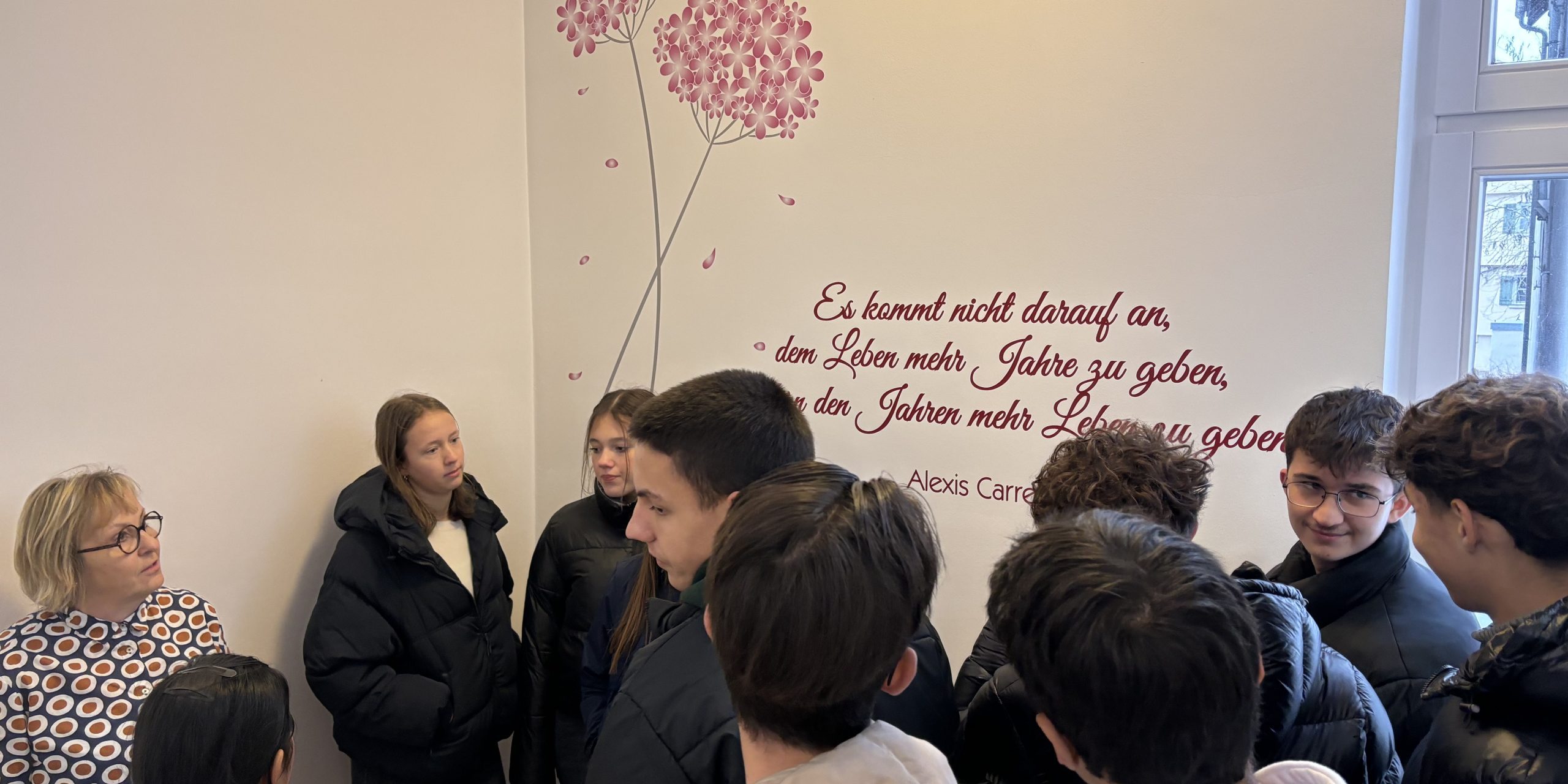 „Es geht nicht darum, dem Leben mehr Tage zu geben, sondern den Tagen mehr Leben.“ Unter diesem Motto Cicely Saunders, der Gründerin der modernen Hospizbewegung, besuchte der Ethikkurs der 10. Klasse das Hospiz der St. Elisabeth Stiftung inmitten von Biberach. Frau Haid, Pflegedienstleitung des Hauses, hatte sich die Zeit genommen, uns für eine Stunde durch die beeindruckende Einrichtung zu führen. Dabei erzählte sie nicht nur über den Ablauf eines Hospizdienstes, sondern auch von lebensnahen, berührenden Geschichten der Gäste. Bei der Führung durch das Haus durften wir mit dem Einverständnis eines Gastes auch ein Zimmer besichtigen. Der Besuch zeigte auf sehr eindrückliche Weise, wie wichtig die Arbeit eines Hospizes gerade am Lebensende ist, er wird sicher auch durch die offene Gesprächsführung von Frau Haid noch lange nachhallen, vielen Dank dafür!
