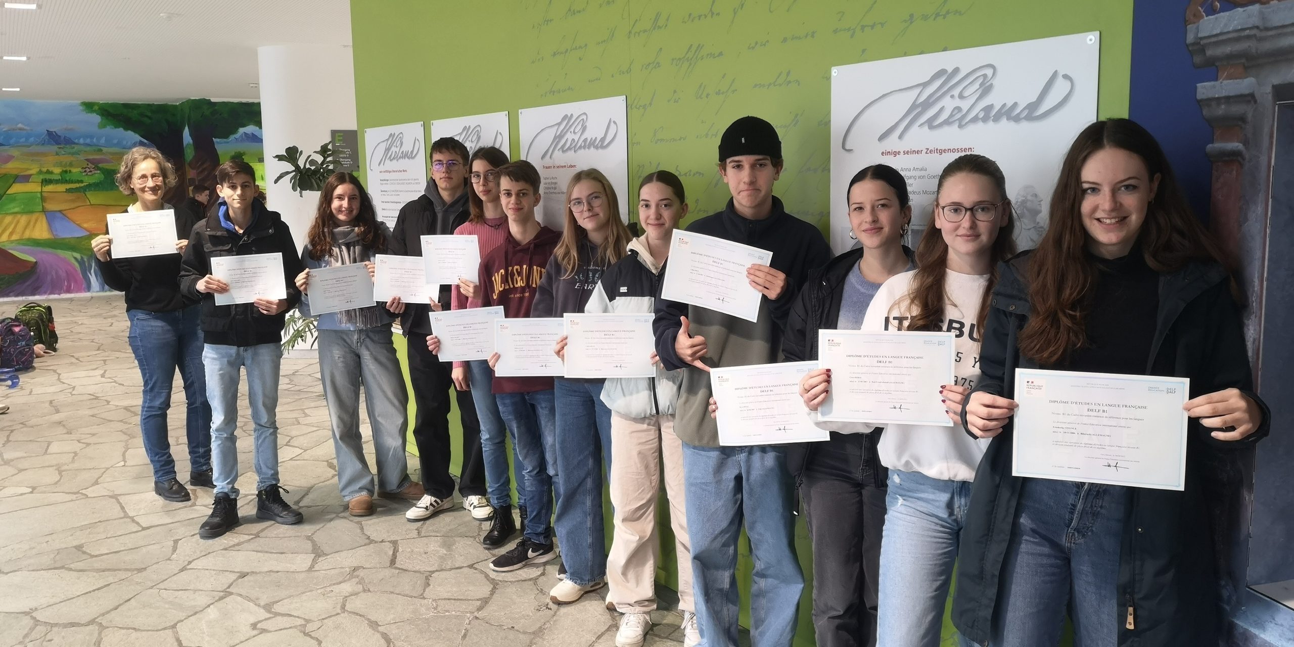 Die Schülerinnen und Schüler auf dem Foto halten ihre DELF-Diplome in den Händen. Sie haben unter Beweis gestellt, dass sie prima mit der französischen Sprache zurechtkommen, indem sie gezeigt haben, dass sie das gesprochene und geschriebene Französisch verstehen und dass sie selber auf Französisch sprechen und schreiben können. Für ihren Mut, die Prüfung zu machen, wurden sie mit dem „Diplôme d’Études en Langue Française“ belohnt. „Damit habt ihr ein wertvolles Papier, das ihr eurer Bewerbung später beilegen könnt. Das entspricht dem Cambridge-Certificate“, erklärt Schulleiter Ralph Lange in seiner Glückwunschansprache.