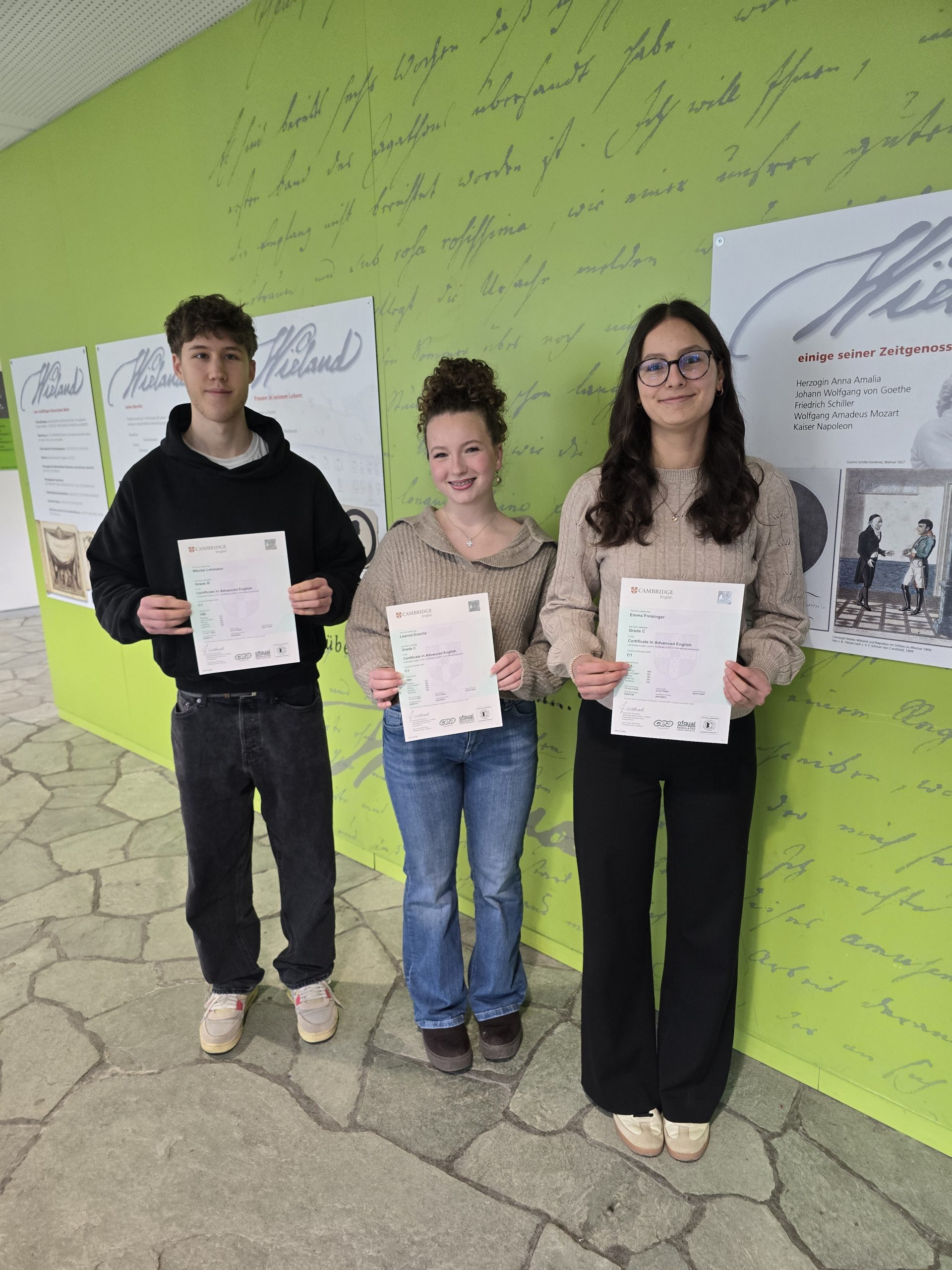 Nach erfolgreichem Bestehen der Cambridge-Prüfung erhielten die Teilnehmerinnen und Teilnehmer der Cambridge-AG am Wieland-Gymnasium ihre Zertifikate, überreicht von Schulleiter Ralph Lange und Fachlehrerin Julia Maier.