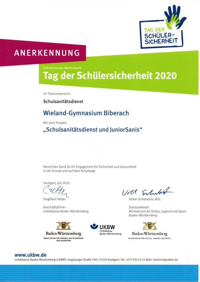 Anfang Dezember 2020 wurde für die Lehrkräfte und Beschäftigten des Wieland-Gymnasiums erneut eine freiwillige Corona-Testung durchgeführt. Die Schulsanitäter Alicia, Lena, Hanna und Jannik unterstützten dabei organisatorisch Herrn Dr. Grill (Abstrichnahme)…