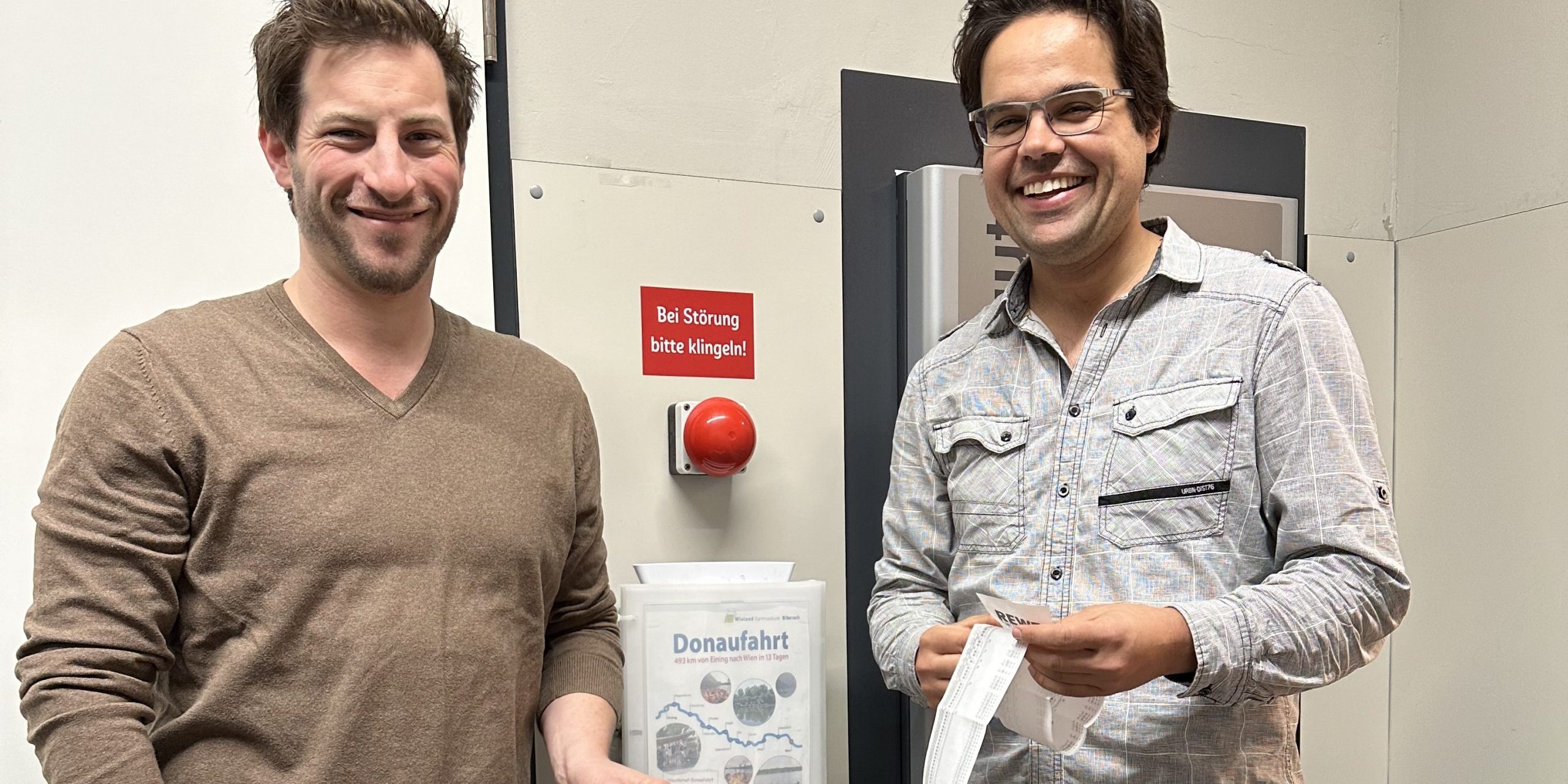 Vier Monate lang konnten die Kunden des vom ehemaligen WG-Schüler und Donaumentor Benjamin Sabo geleiteten Rewe am Bahnhof in Biberach ihren Pfandbon für die Donaufahrt spenden. Am Montag, den 16.10. übergab Benjamin Sabo den langen Pfandbon an unseren Donaubeauftragten Alexander Diesch. Das Wieland-Gymnasium bedankt sich recht herzlich für den Einsatz von Benjamin Sabo und für die großzügige Spende.